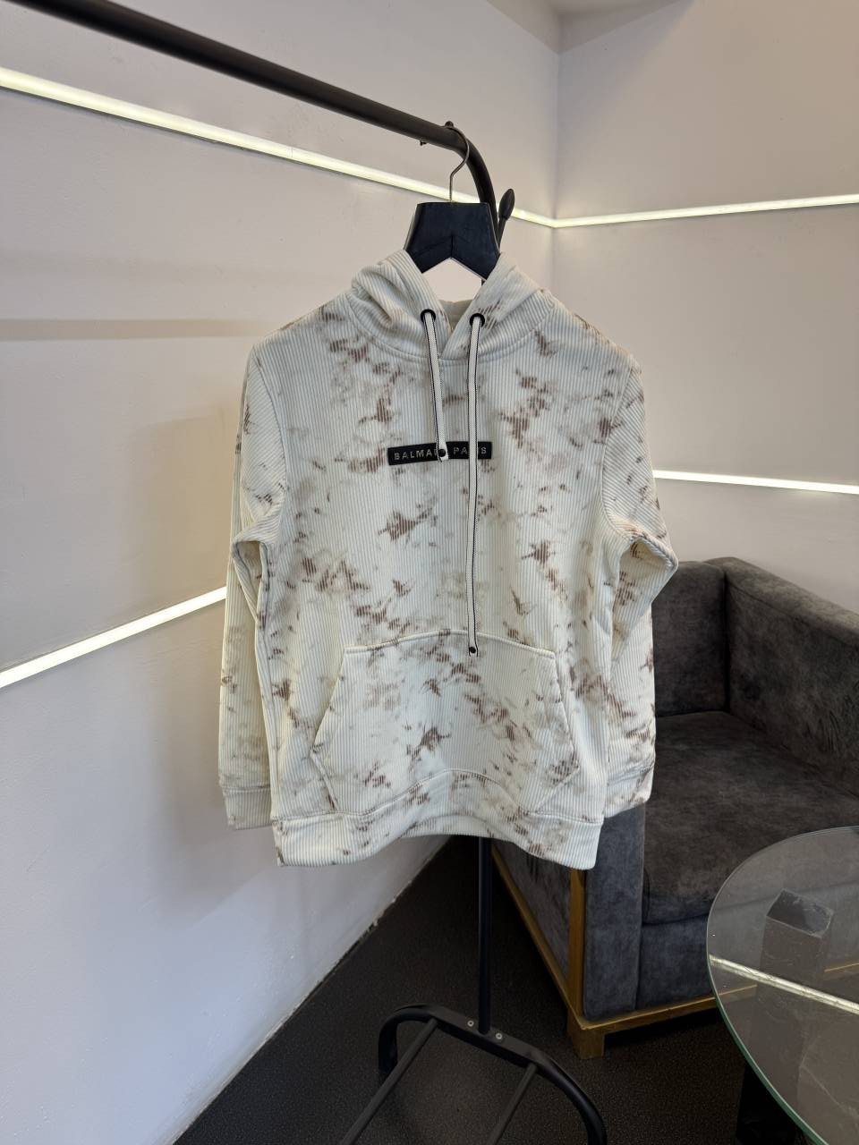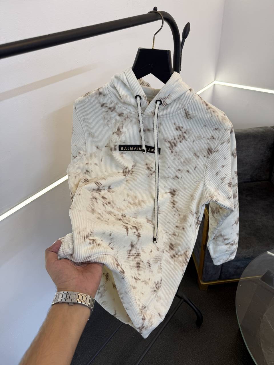 ? *Balmain imported washing cloudy look textured knitted fabric soft feel hoodie with balmain imported pu metal badge on chest front now in stock*?
