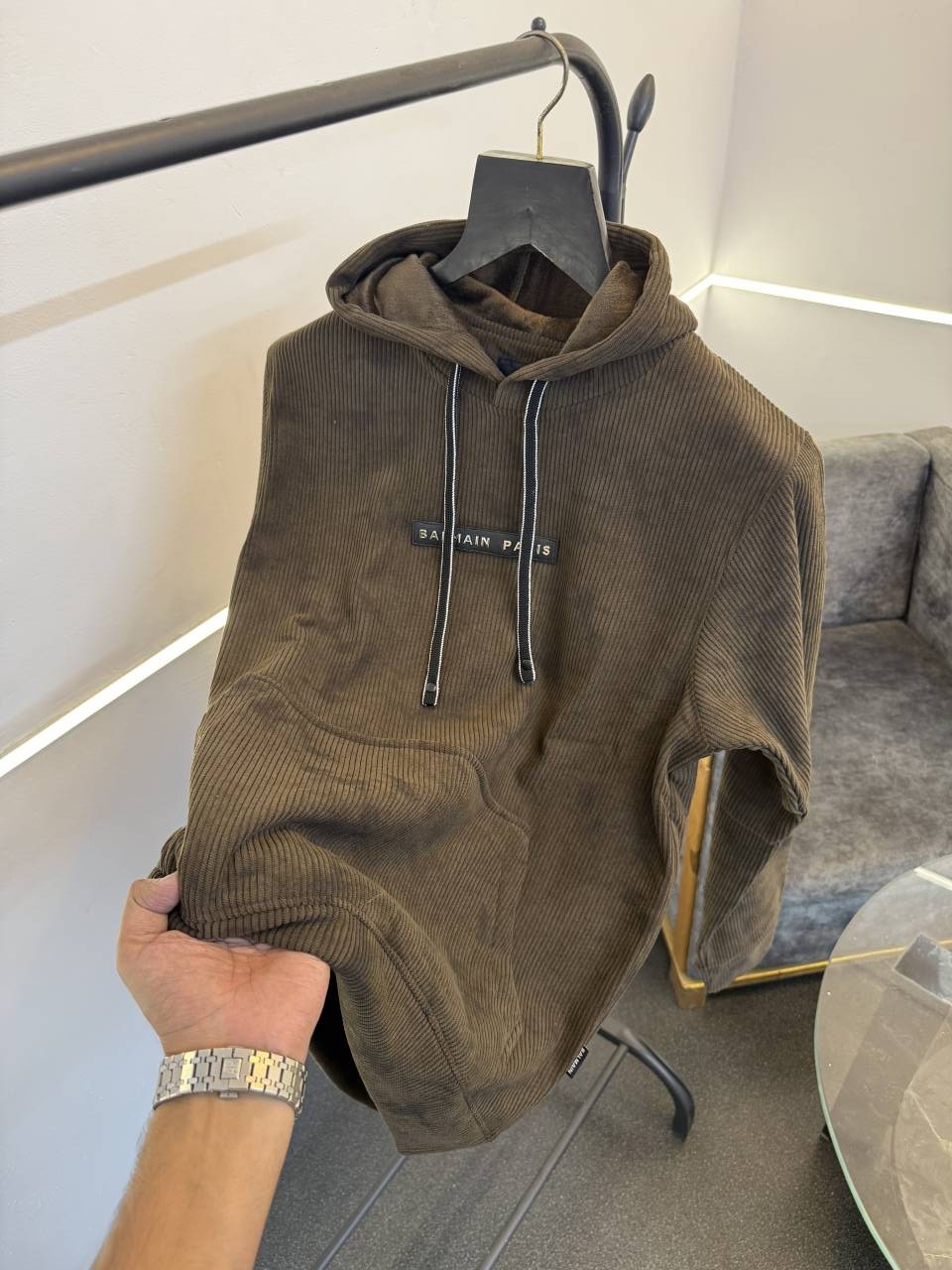 ? *Balmain imported washing cloudy look textured knitted fabric soft feel hoodie with balmain imported pu metal badge on chest front now in stock*?